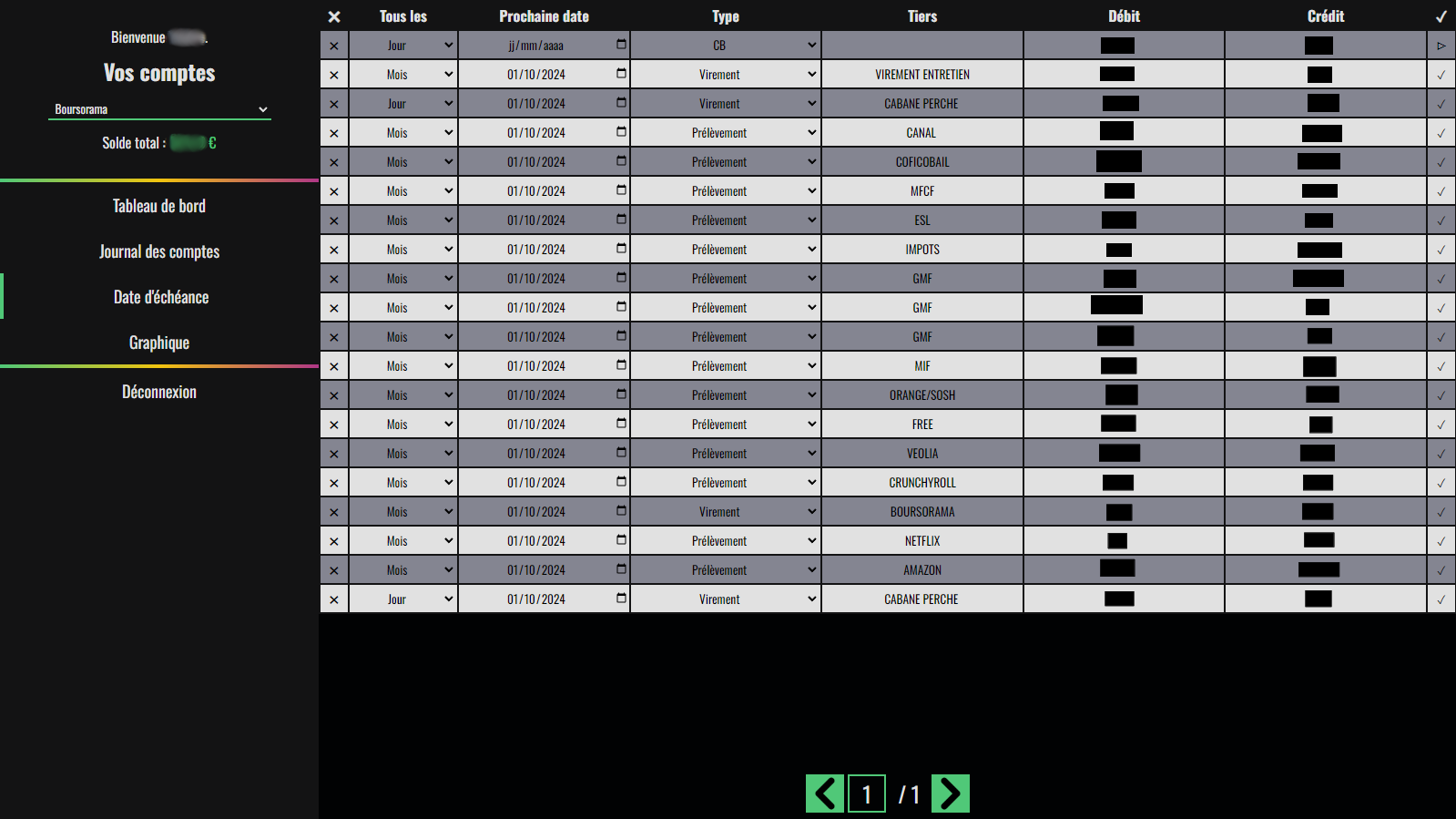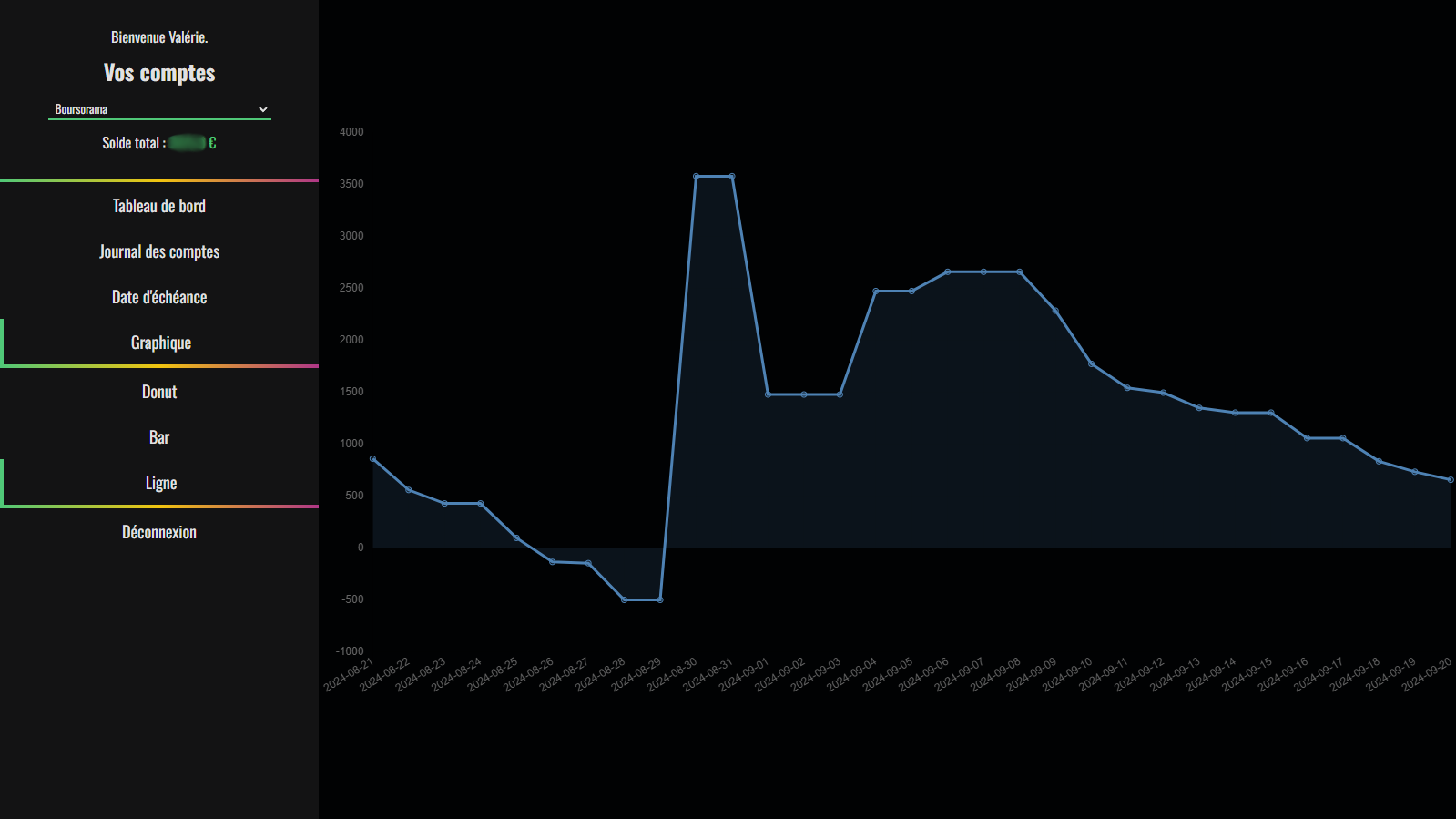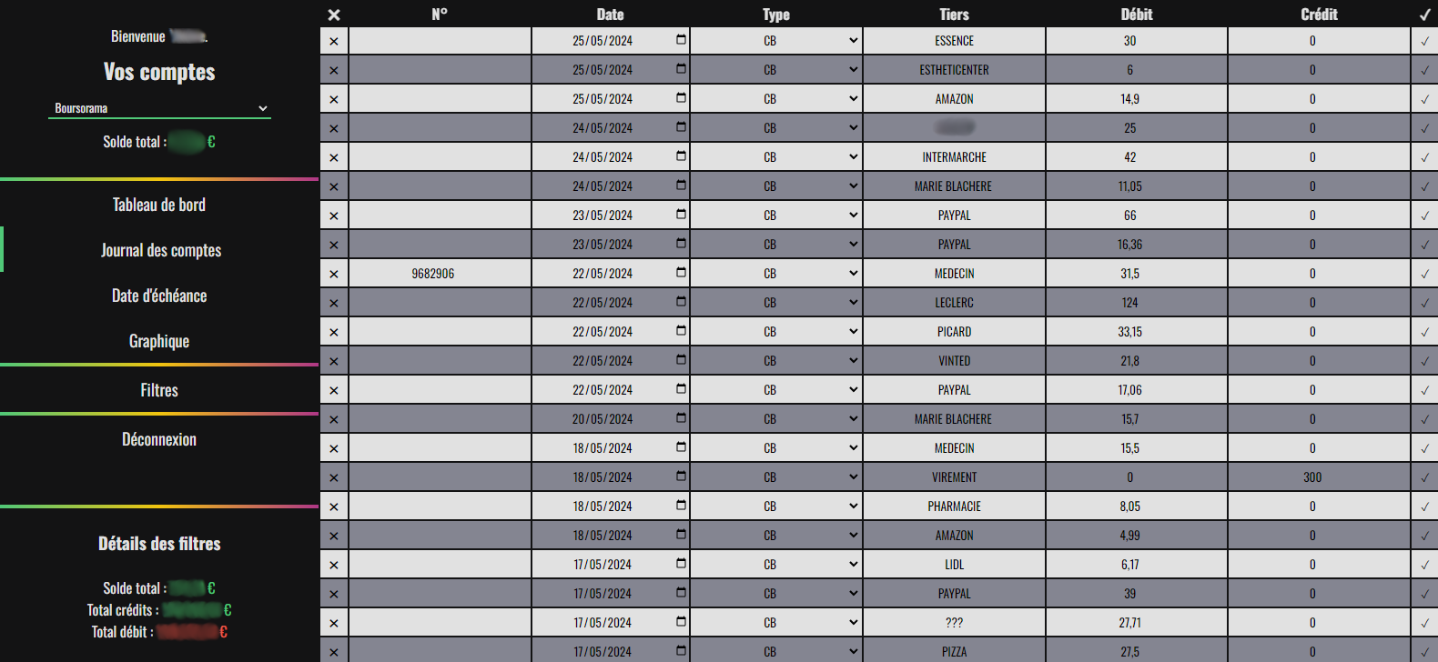 Here is ManagU, a banking account management site designed in HTML5, CSS3, JavaScript, and PHP. It uses a local MySQL database to store all necessary information. For instance, you will find a "Journal" tab where you can record all your transactions in detail. The "Due Dates" tab allows you to schedule recurring transactions (daily, weekly, monthly, or yearly). Additionally, the "Charts" tab offers a clear overview of your finances. Many other options are available to simplify the user's work.
